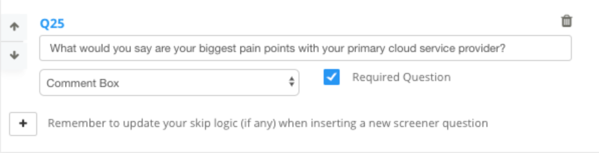 This question format can also test how articulate or knowledgable potential participants are about the topic at hand. Asking a comment box question prior to them seeing specific qualification questions also minimizes the chances of tipping them off to who your target audience is and then providing biased responses.